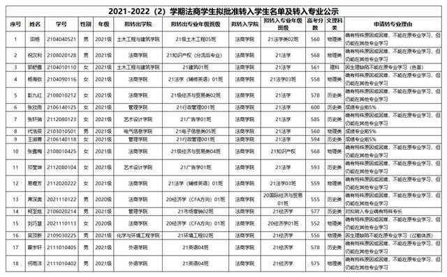 根據(jù)法商學(xué)院《2021-2022學(xué)年第二學(xué)期轉(zhuǎn)專業(yè)工作方案》的通知,結(jié)合學(xué)院專業(yè)設(shè)置情況,經(jīng)學(xué)院黨政聯(lián)席會(huì)研究,擬接受以上18名學(xué)生的轉(zhuǎn)專業(yè)申請(qǐng)。